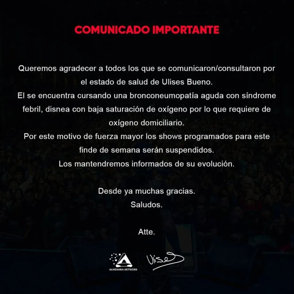 "Queremos agradecer a todos los que se comunicaron/consultaron por el estado de saluda de Ulises Bueno. Él se encuentra cursando una bronconeumopatía aguda con síndrome febril, disnea con baja saturación de oxígeno, por lo que requiere de oxígeno domiciliario", explica el comunicado.