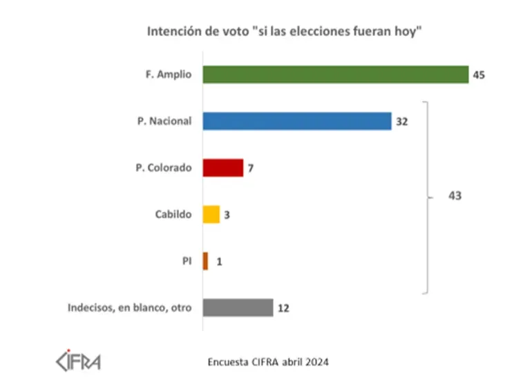 Si las elecciones fueran hoy, 45% votaría al Frente Amplio y 43% a la coalición multicolor, según la última encuesta de Cifra presentada este martes en Telemundo (Canal 12).