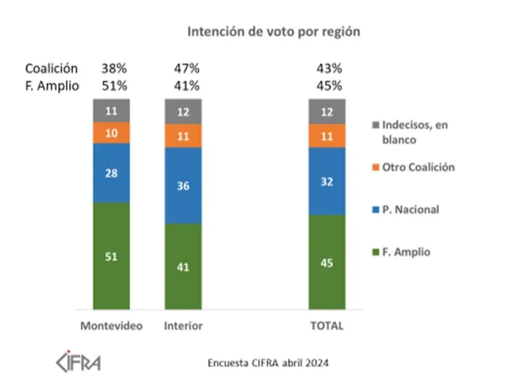 Por su parte, en el interior del país el 47% votaría a la coalición y el 41% al Frente Amplio.