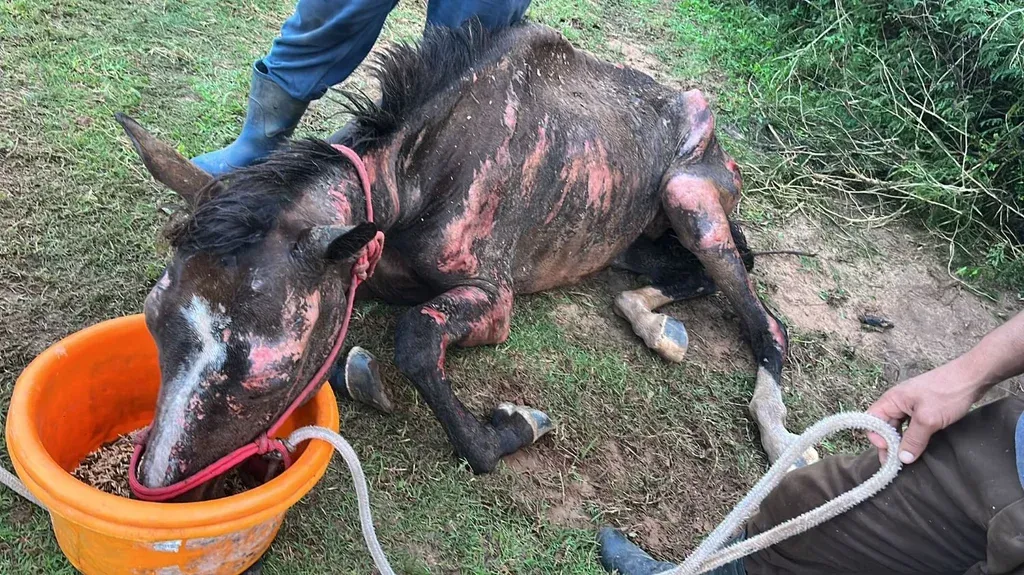 Uno de los equinos rescatados en Artigas, con una desnutrición muy grave. Sobre cómo se puede colaborar, no dudó en autorizar que publiquemos el número de su celular: 094 783 114.