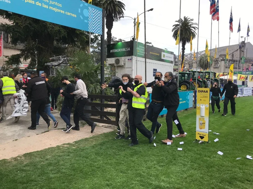 Pero hubo más. Como en 2019, un grupo de 10 jóvenes ingresó sin permiso al ruedo portando bengalas con humo de color azul y gritando “¡Los animales no son comida!”. Fue cuando estaba exponiendo el intendente. Pagaron la entrada para ingresar al predio, tenían tapaboca, pero saltaron las vallas de madera para entrar al sitio donde se realizaba el acto inaugural. Todo duró un minuto hasta que funcionarios de la ARU retiraron a esas personas –primero del ruedo y luego del predio de exposiciones, sin violencia–.