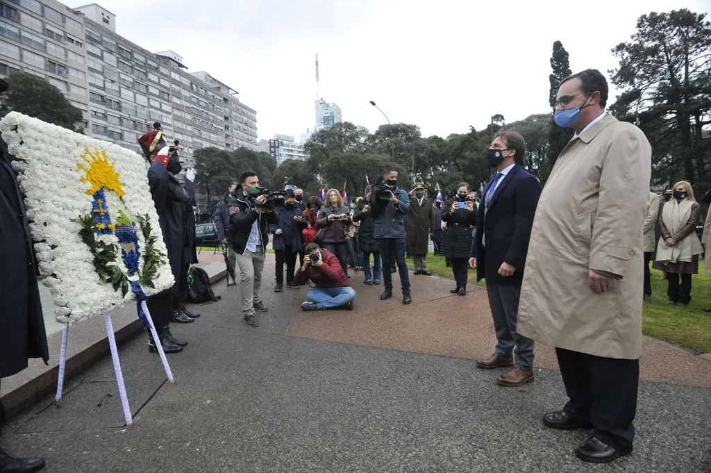 La lluvia fuerte, que empapó a los blandengues en los aprontes previos, paró unos 15 minutos antes de la llegada del presidente Luis Lacalle Pou al Obelisco. Después de los saludos de rigor con los militares, el presidente se dirigió hacia dónde estaba el resto de las autoridades de gobierno en pleno –ministros, director de la OPP, vicepresidenta– y les dijo: “Podríamos repetir la foto de las gabardinas”, en alusión a abril de 2018, cuando los líderes de la que era la oposición en ese momento presentaron la denuncia penal por las irregularidades de la gestión de Ancap . También este sábado la gran mayoría de los integrantes del gabinete llevaban las típicas gabardinas beige, lo que le hizo comentar a la ministra de Vivienda, Irene Moreira, que parece ser el uniforme del Ejecutivo.