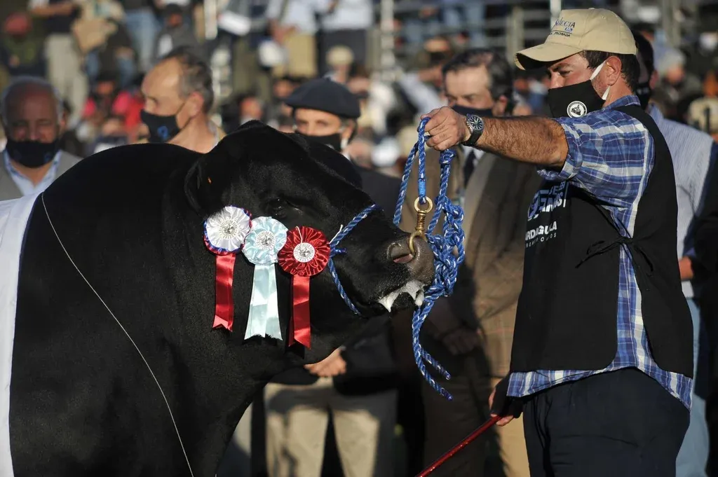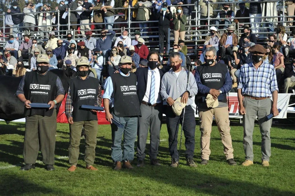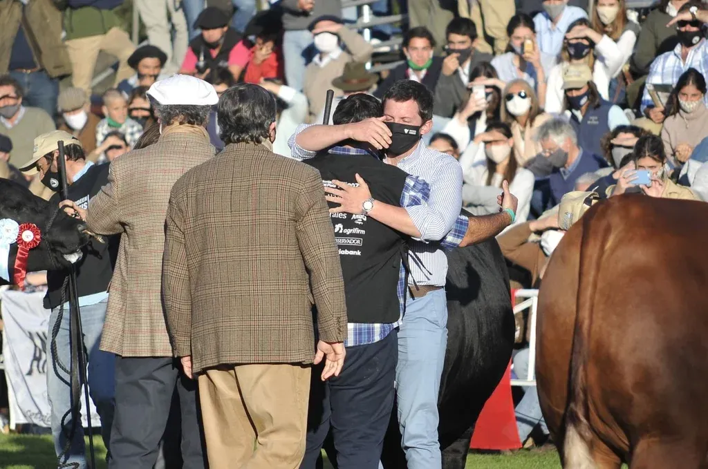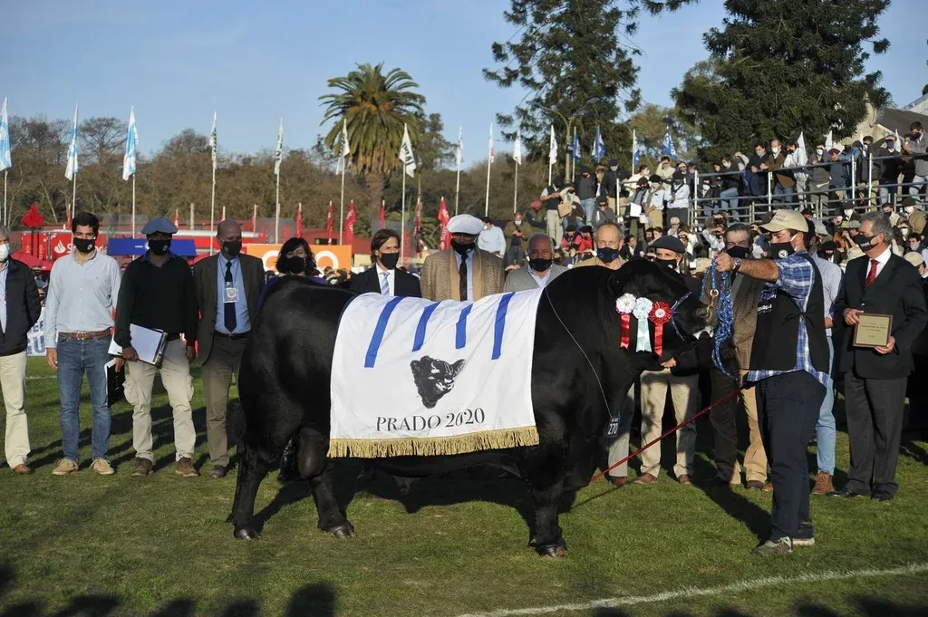 La premiación duró un buen rato. Porque la lideró Lacalle Pou, en un nutrido grupo de autoridades –el presidente entregó la cocarda tricolor– conformado por Gabriel Capurro, presidente de la Asociación Rural del Uruguay (ARU); Diego Oribe, presidente de la Sociedad de Criadores de Aberdeen Angus del Uruguay; Carlos María Uriarte, ministro de Ganadería, Agricultura y Pesca; Faye 0’Connor, embajadora del Reino Unido en Uruguay; Carlos María; José Bonica, presidente del Instituto Nacional de Investigación Agropecuaria; y Fernando Mattos, presidente del Instituto Nacional de Carne.