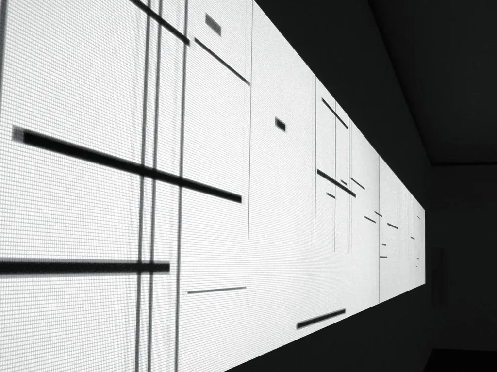 Ramírez Gaviria tomó las líneas de las pinturas de Mondrian y se las alimentó a un programa que escoge cierto número de líneas, de forma impredecible e irrepetible, y las devuelve en el espacio expositivo. Cuando chocan con las esquinas de la proyección o entre ellas cambian de dirección, aumentan de velocidad, hasta que desaparecen por los lados de las proyecciones y dan comienzo a un nuevo ciclo compositivo. Una nueva composición visual y sonora porque lo combina con fragmentos de jazz. Un cambio periódico e impredecible.