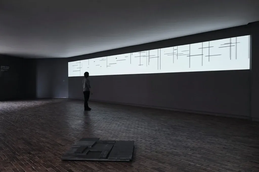 Las líneas se trasladan en el fondo blanco, chocan, se dispersan y se reconstruyen. La periodicidad del tiempo y el espacio en una proyección de luz. La videoinstalación se titula Composition y el artista, Andrés Ramírez Gaviria, camina entre grupos de jóvenes montevideanos. Originalmente la obra tiene 11 metros y medio de largo, el equivalente a las 15 pinturas transatlánticas de Piet Mondrian, a las que volvió con una mirada contemporánea. Este fin de semana se adaptó a una pequeña sala en el Centro de Exposiciones Subte.