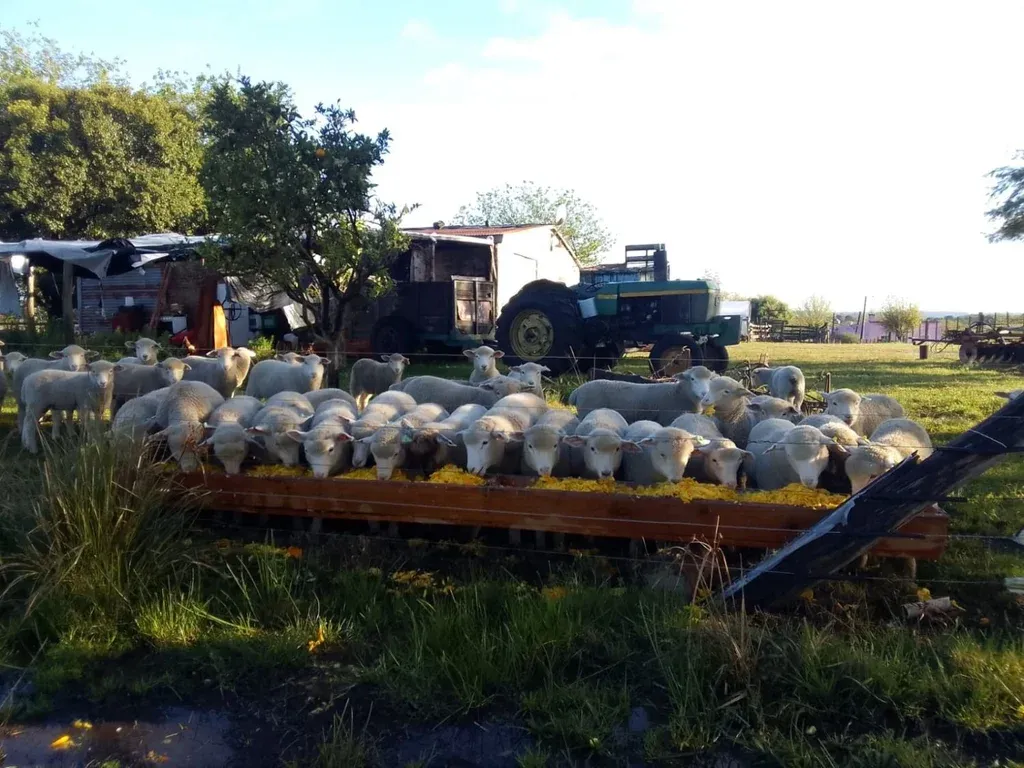 Sí hay ya un conjunto de corderos destetados hace un mes que están en el régimen de feedlot, comiendo fardo de silo de alfalfa y la punta de la naranja que obtiene como residuo industrial de una fábrica de jugo.