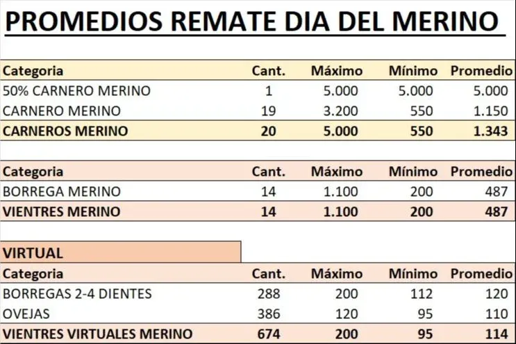 De los animales que se vendieron en pista, los carneros promediaron US$ 1.343, mientras que los vientres US$ 487. Por su parte, la oferta que se vendió de forma virtual, que estuvo compuesta por borregas de dos a cuatro dientes y ovejas, tuvo un promedio de US$ 114.