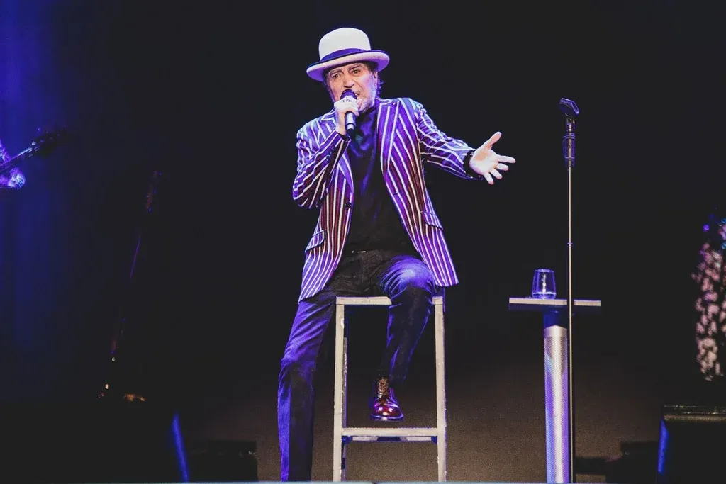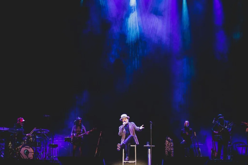 El descanso le viene bien a un Sabina de 74 años que prácticamente no se levanta de su banco –al que luego le agregan una mesa, donde apoya el codo e ilustra más aún la escena de un bar– en todo el concierto.