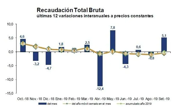 La recaudación del IVA alcanzó los $ 16.131 millones en setiembre 2019, representando de esta forma el 46,5% de la recaudación total bruta. En setiembre la variación real fue de 7,7%, mientras que en el año móvil cerrado a dicho mes fue negativo en 0,5%. El pasado mes hubo incrementos en términos reales para el IVA interno (+9,6%), a las importaciones (+4%) y el IVA mínimo de pequeñas empresas (+1,2%).