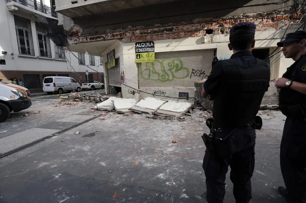 Faltaban pocos minutos para las 17 horas cuando un pretil del edificio en remodelación ubicado en la esquina de Sarandí y Zabala se desmoronó y despertó la rutinaria tarde de calor en Ciudad Vieja. Los escombros que cayeron lesionaron en la pierna a un señor que justo transitaba por el lugar y en la cabeza a una mujer que, también, cruzaba en ese instante esa esquina de Montevideo.