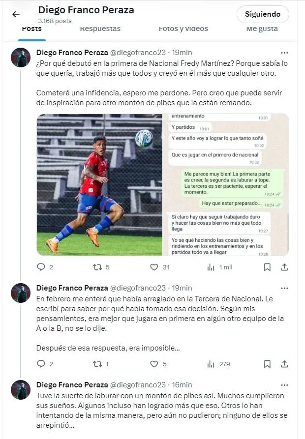 Para confirmarlo, publicó una charla que tuvieron a través de WhatsApp a principio de año cuando el jugador le comentó hace unos meses que "este año voy a lograr lo que tanto soñé, que es jugar en el primero de Nacional".