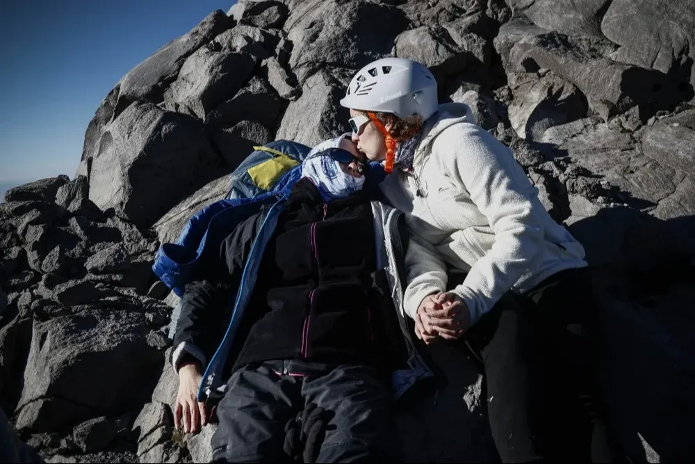 En la tranquilidad del atardecer, Carla Bohème, de 19 años, se recupera, reconfortada por su hermana María mientras los 'sherpas' montañeses mexicanos despliegan las tiendas.