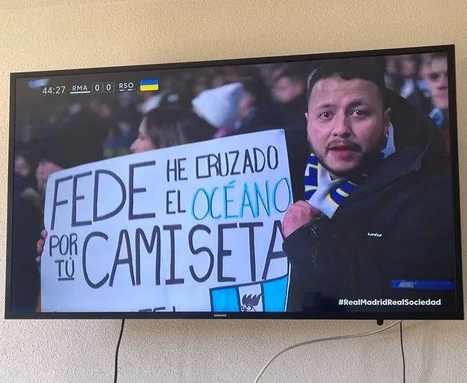 Tal es el caso de un hombre guatemalteco que concurrió este domingo al estadio Santiago Bernabeu para el partido de los merengues contra Real Sociedad, portando una bandera que decía: "Fede, he cruzado el océano por tu camiseta".
