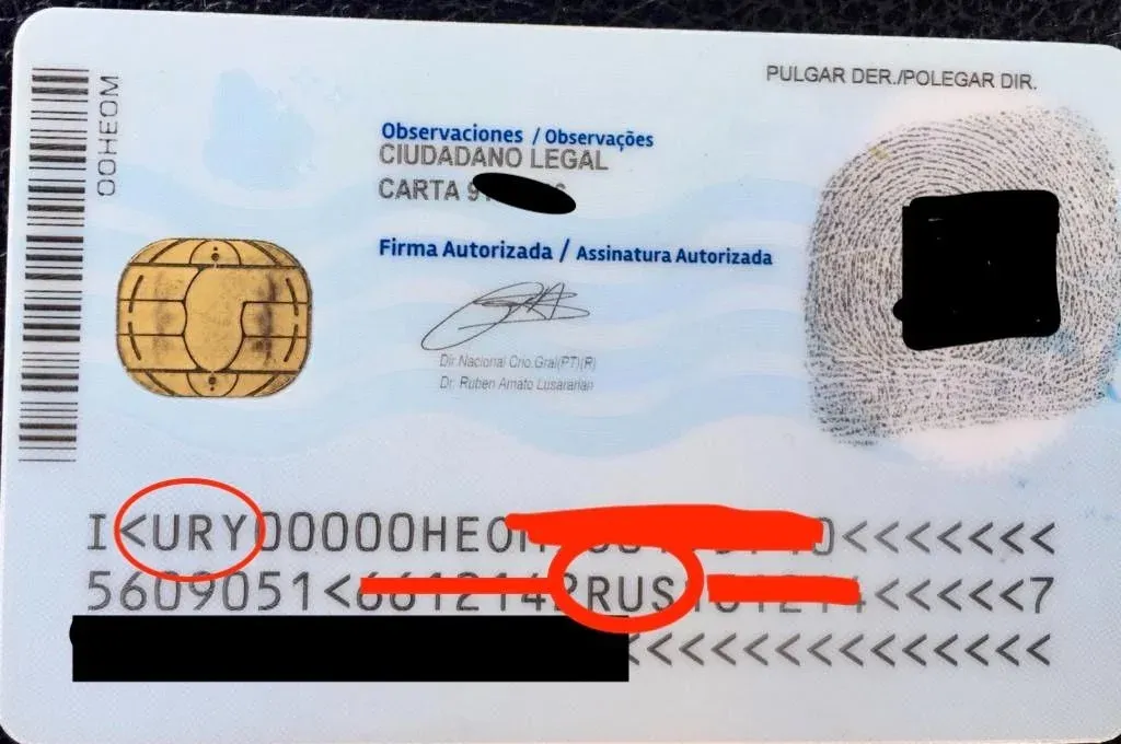 Cedido a El Observador Cédula de identidad de un ciudadano legal uruguayo, donde los códigos de Uruguay y Rusia no coinciden En el Manual de documento de identidad y pasaporte electrónico de la Dirección Nacional de Migraciones del Ministerio del Interior, con fecha de 2018, afirma explícitamente que a los ciudadanos extranjeros “ha de consignarse la nacionalidad”. Se contradice, entonces, con lo dispuesto por la norma internacional: la parte 3 del manual 9303 de la Organización de Aviación Civil Internacional (ICAO, por sus siglas en inglés).
