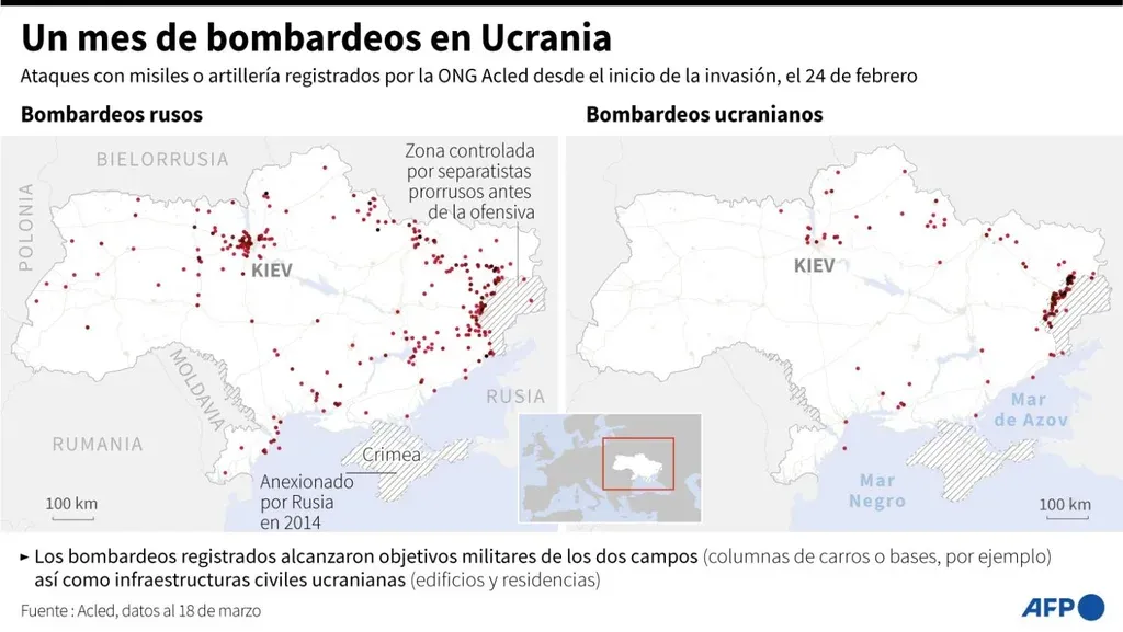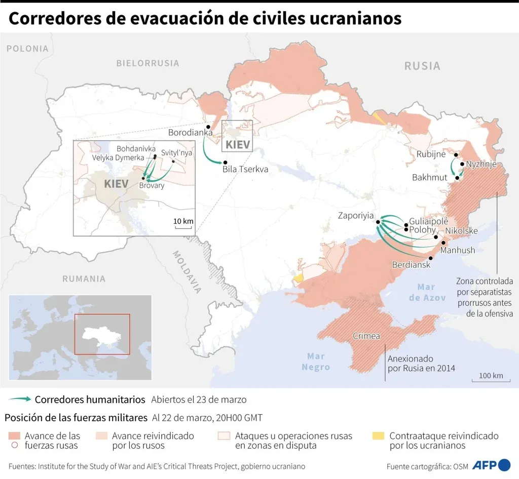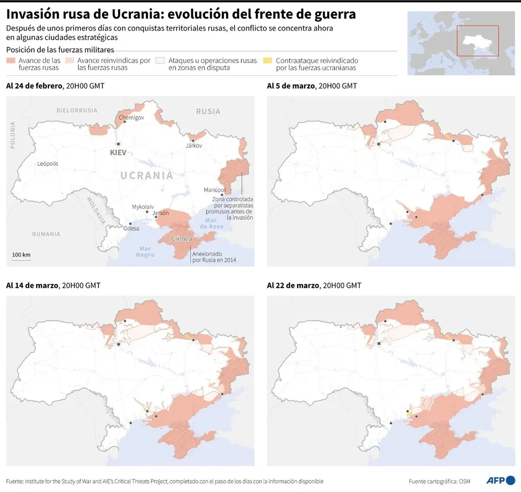 Al 3 de marzo, los rusos habían avanzado por el sur desde Crimea, anexada a Rusia en 2014, y por el este desde las ciudades Donetsk y Lugansk, controlada por separatistas prorrusos. En el norte ya habían alcanzado el oeste de la capital ucraniana, Kiev.