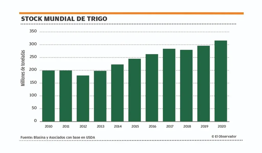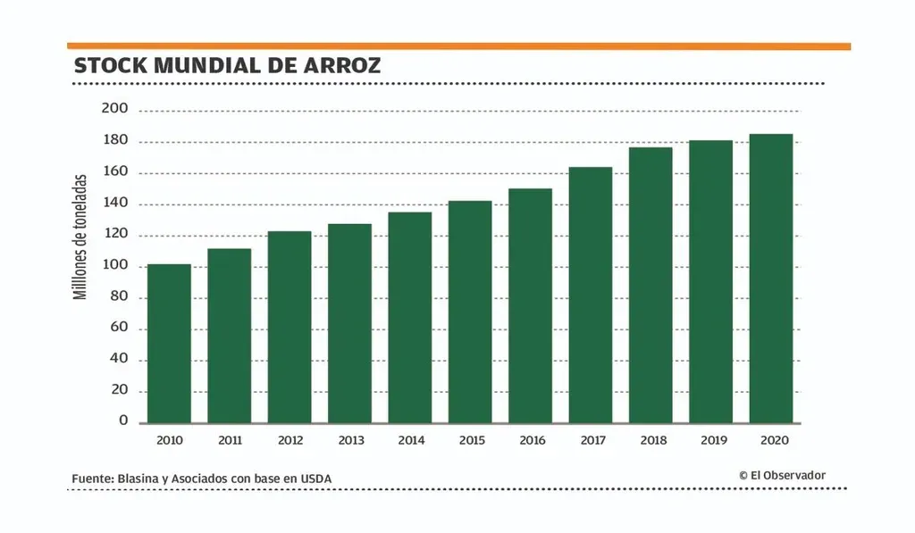 En el panorama mundial, por un lado se destaca la acumulación de reservas en los dos granos más básicos. Tanto el trigo como el arroz tienen niveles récord de reservas previstos para mediados de 2021.
