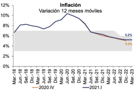 Se espera que la inflación se ubique cercana a 6% a fines de 2021 y a 5% al final del horizonte de política monetaria.