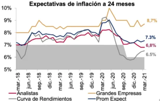 En marzo 2021 el promedio de los tres indicadores de expectativas de inflación que monitorea el BCU para el horizonte de política (24 meses) se ubicó en 7,3%, casi dos decimas por encima del registro de diciembre 2020.