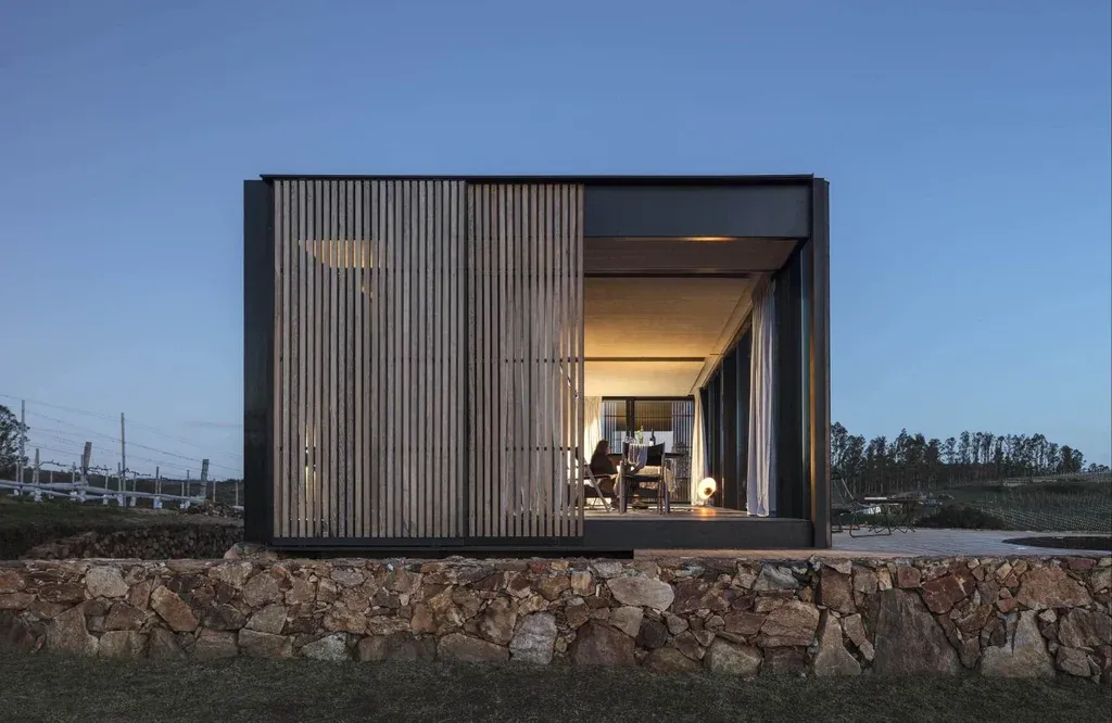 Por su parte, el alojamiento siempre apuntó a preservar la imagen de la zona. Sacromonte se compone de cuatro cabañas minimalistas con contrafrente de roble y fachada en vidrio espejado unidireccional que permite a las estructuras mezclarse con el entorno local al mismo tiempo que brinda vistas panorámicas del campo desde el interior de las habitaciones.