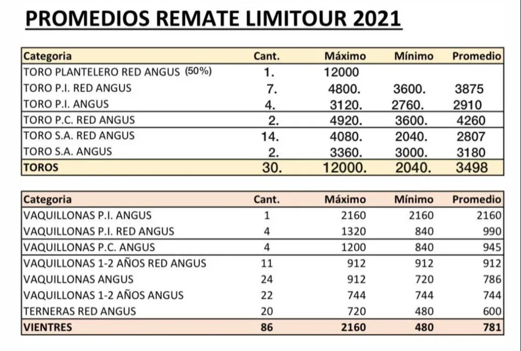 En el remate Limitour, de la cabaña Salto, un toro Angus colorado plantelero cotizó en US$ 12.000, al venderse el 50% en US$ 6.000. El animal fue rematado por la firma Zambrano & Cía. El valor de ese ejemplar fue el máximo de la venta.