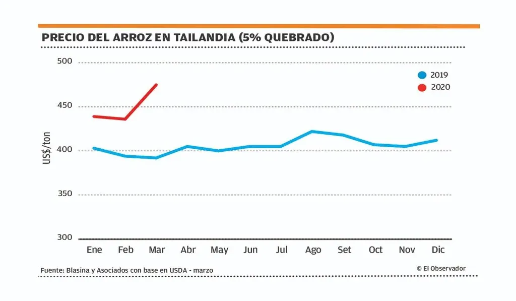 No solo se dispararon las ventas de arroz en el mercado local, sino que a nivel global las góndolas de los supermercados se han visto vaciadas del cereal y el precio en Tailandia se dispara, lo que puede ser una ayuda totalmente inesperada para la cosecha arrocera que está en sus comienzos en Uruguay.