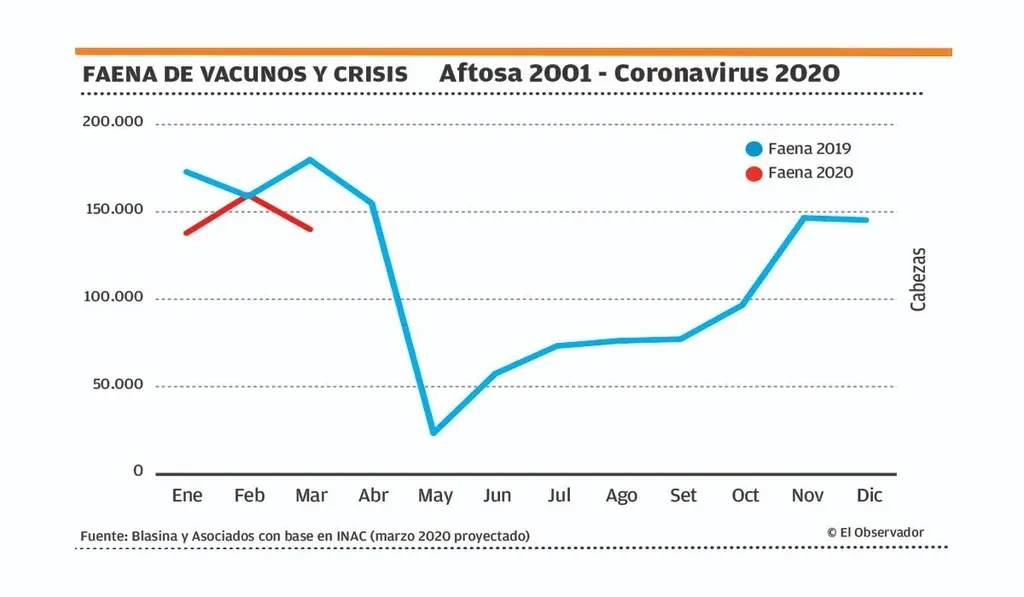 De todos modos, no pareciera comparable en volumen al derrumbe cuando hubo fiebre aftosa en el país. En aquel entonces la faena de mayo de 2001 no llegó a 30 mil vacunos desde más de 150 mil en abril. No pasará eso esta vez. Pero la actividad de la industria ya venía bajando de 2,3 millones a 2,1 millones en períodos de 12 meses. Caerá por debajo de los 2 millones anualizados en el próximo trimestre.