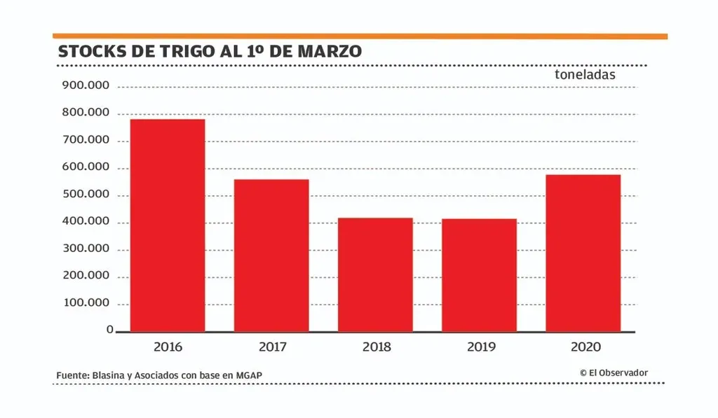 “La cosecha pasada de trigo de Uruguay dejó un saldo exportable de 250.000 toneladas, pero por ahora sólo se comercializaron unas 100.000 toneladas. La oferta está esperando mejores precios y las molinerías abastecidas, al menos hasta mediados de año. Todo esto llevó a un aumento en los stocks de trigo en Uruguay”, explicó Villamil.