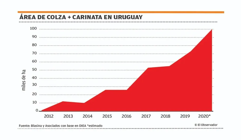 El área sembrada con las oleaginosas de invierno –con una mayor participación de colza– alcanzó en 2019/20 un récord de 73.000 has, según la Dirección de Estadísticas Agropecuarias (DIEA), el triple que las sembradas cinco años atrás.