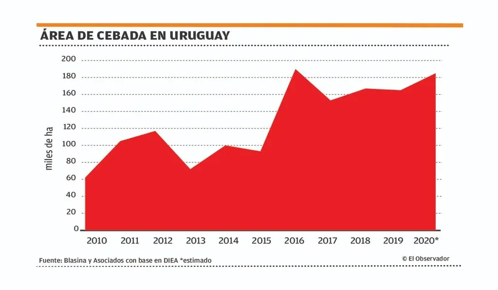 En principio el área de cebada quedaría similar a las 185 mil hectáreas del año pasado, con posibilidad de subir unas 20 mil hectáreas más si surgen negocios sobre mayo o junio, si los buenos precios se mantienen.