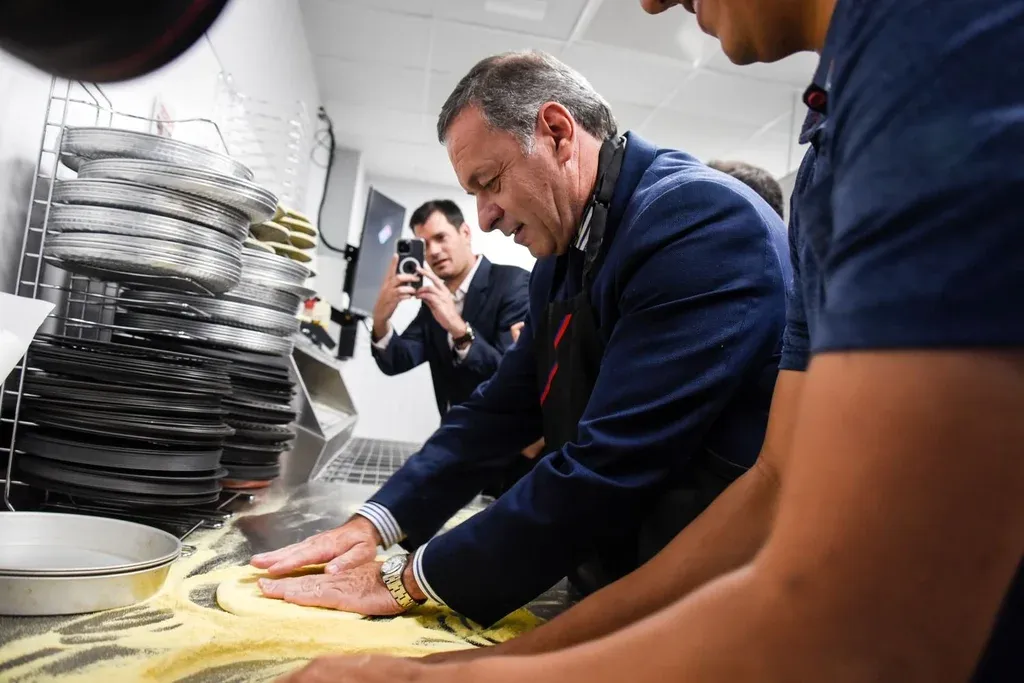 El secretario de Presidencia preparando una pizza en la inauguración de Domino´s Pizza