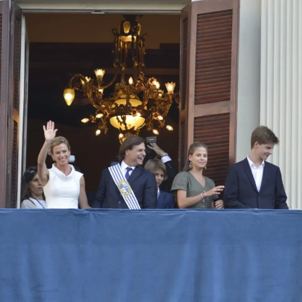 La ceremonia protocolar fue interrumpida porque el presidente quiso ir al balcón para saludar junto a su familia y la vicepresidenta Beatriz Argimón a los militantes que se conglomeraron en la plaza.