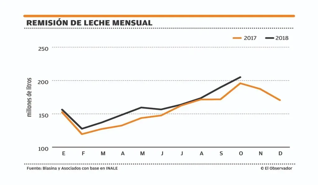 Hasta setiembre, el volumen enviado a todas las industrias del país venía siendo 6% superior al de un año atrás (1.412 millones de litros contra 1.328 millones), aunque con una facturación en dólares que por quinto mes consecutivo está por debajo en la comparación interanual, según se desprende de los datos que recaba el Instituto Nacional de la Leche (Inale).