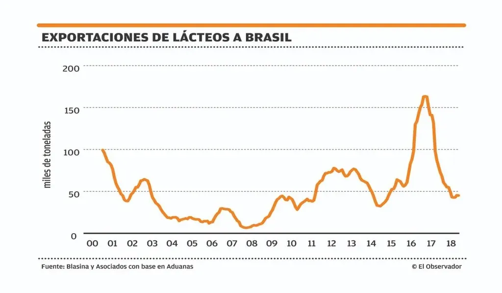 Brasil –con el que hay ventajas arancelarias por el Mercosur– tuvo una fuerte baja este año. En los primeros 10 meses del año se exportaron a este destino 40.561 toneladas, casi 23.000 menos (36% menos) que las 63.366 vendidas en el mismo período del año pasado. Esta caída está explicada principalmente por un aumento de la productividad de Brasil, que ha mostrado una tendencia al alza en los últimos cinco años, por la desaceleración económica y la disminución del valor de la moneda brasileña en 2018. Una fuente industrial señaló que a pesar de la caída es esperable que el mercado brasileño se mantenga como uno de los principales compradores de lácteos de Uruguay.