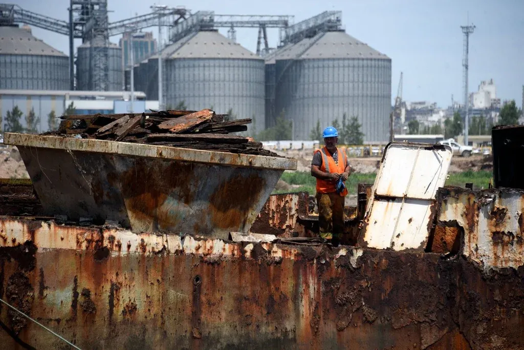 Los barcos son cortados en partes. Los restos de dos embarcaciones serán cargados en otro buque que va por el río hasta Puntas de Sayago.