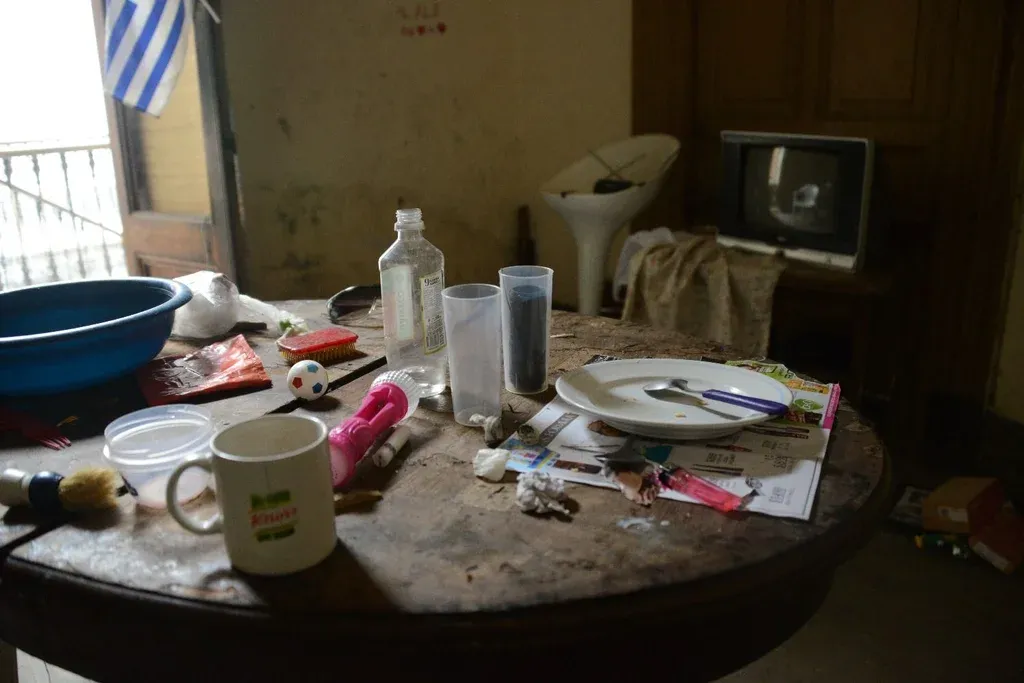 A ese patio salen varias habitaciones, y la escena es casi idéntica en todos: agolpados, sin orden aparente, se enredan mesas con botellas de plástico, vasos, bolsas de nailon, un televisor en el suelo, humedad y polvo, heladeras antiguas, una palangana azul, un balde rojo, un ventilador, polvo y humedad, papel higiénico, lentes negros, silla de plástico, sillones destruidos, championes desparramados, chancletas perdidas, humedad, polvo.