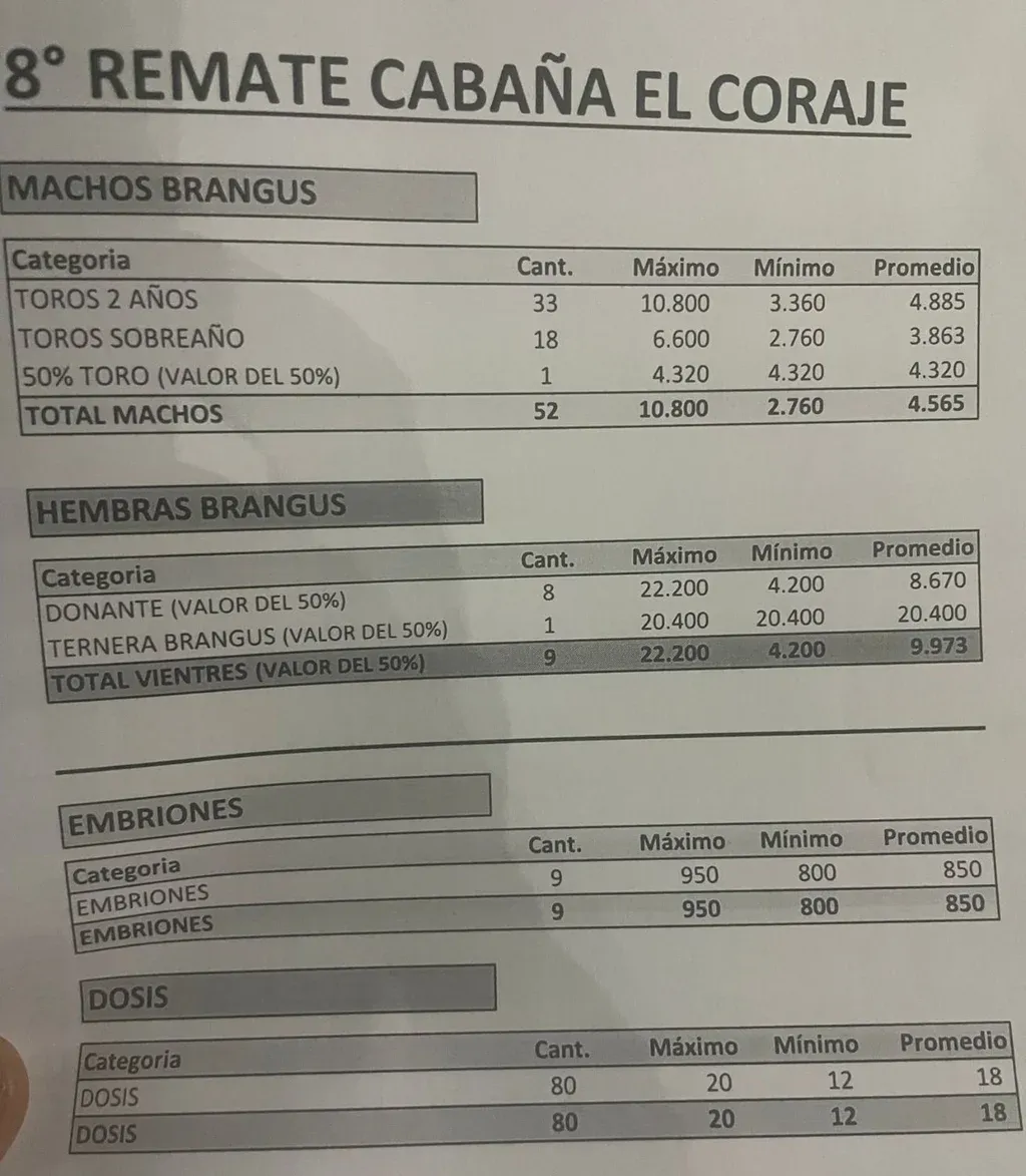 Los machos se vendieron, en promedio, a US$ 4.565, las hembras a US$ 9.973, los embriones a US$ 850 y las dosis de semen a US$ 18.