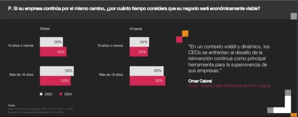 Aunque los 4.702 CEO´s que respondieron la encuesta anual global de Pwc de este año (57 de ellos en Uruguay) son más optimistas respecto del crecimiento económico global que el año pasado, el 45 % todavía no confía en que sus empresas sobrevivirán más de una década si siguen en el camino actual. En Uruguay, uno de cada tres CEO´s encuestados considera que sus compañías no serán viables dentro de 10 años.
