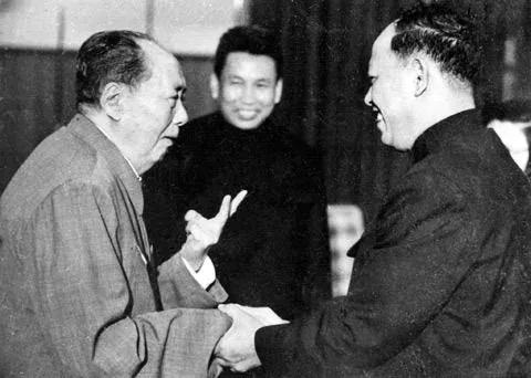 El expresidente chino Mao Zedong saluda al "hermano número 3", Ieng Sary, mientras Pol Pot, en el centro de la foto, los mira