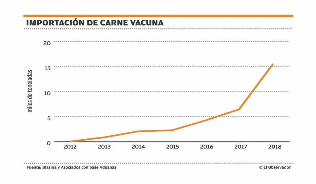 La carne importada que aparecía ocasionalmente en algún supermercado de la capital ahora llega a todo el país. La devaluación de Brasil y Argentina y la competitividad de Paraguay fueron las que generaron el incremento del volumen importado. Al cierre de 2018 se importaron 15.432 toneladas de carne vacuna por un total de US$ 59 millones (CIF), más del doble que las 6.430 toneladas que se habían comprado el año pasado y el mayor volumen importado en la historia. En todos los meses del año –excepto noviembre– las compras de carne vacuna superaron a las del 2017. El pico se dio en agosto con 1.988 toneladas importadas. Luego comenzó una tendencia de estabilización en el entorno de 1.200 toneladas mensuales.