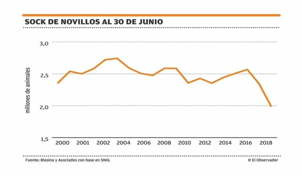 Según los datos recabados por el Sistema Nacional de Información Ganadera (SNIG), el stock vacuno mostró una caída interanual de 403.837 cabezas y quedó en 11,328 millones de animales. El 86% de la baja poblacional correspondió a novillos, con 349.000 menos que el año anterior. De esa forma alcanzaron los 1,994 millones (una caída muy similar a la cantidad de terneros y novillos que se exportan en pie en un año).