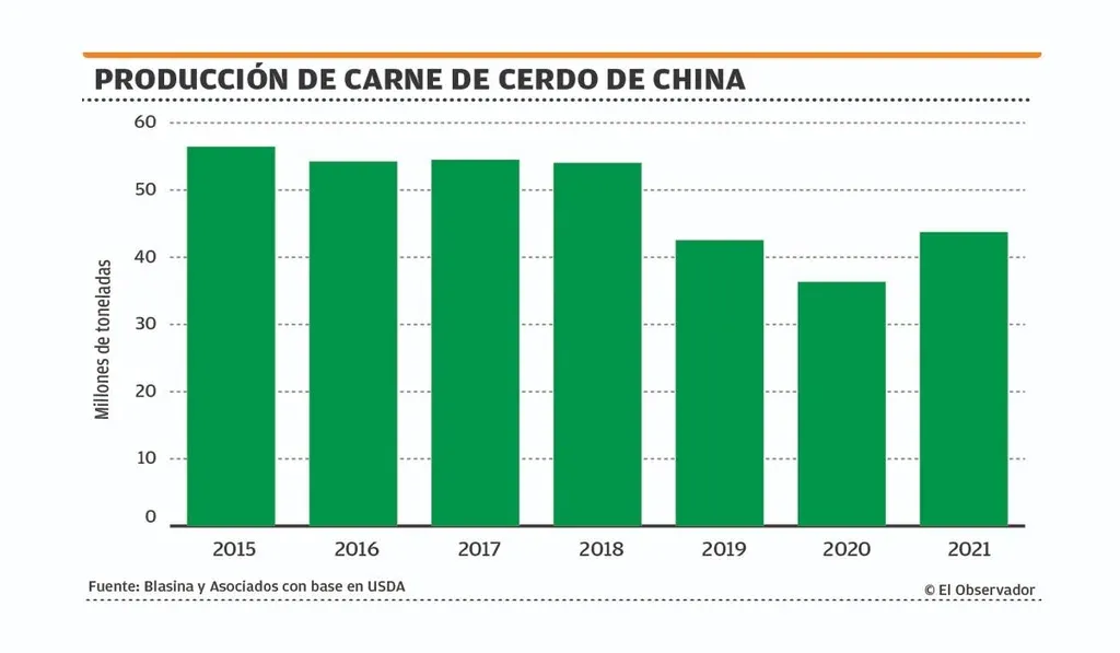 China, principal productor y consumidor de carne de cerdo del mundo, venía de generar 54 millones de toneladas establemente en 2017 y 2018. Esa producción cayó a 42 millones en 2019 y a 36 millones en 2020. En 2021 se recuperaría a 44 millones de toneladas, muy superior a las 40 millones que se proyectaban en abril.