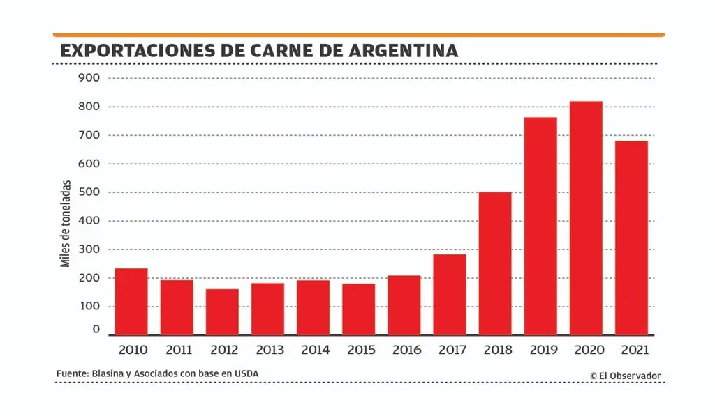 Las importaciones bajarían 1%. La restricción en la oferta lleva a una leve reducción de las importaciones a pesar de que en Asia se mantienen a gran ritmo. Pero el informe redujo la proyección de importación de carne vacuna de China respecto a la proyección previa, aunque sigue bien por encima a las del año pasado. En lugar de 3,1 millones de toneladas que se esperaban en la proyección de abril, ahora se esperan 3 millones de toneladas importadas. Un crecimiento significativo respecto a los 2,78 millones importadas en 2020, pero una moderación en el crecimiento, factiblemente por la recuperación de la producción de carne de cerdo, que supera las previsiones anteriores.