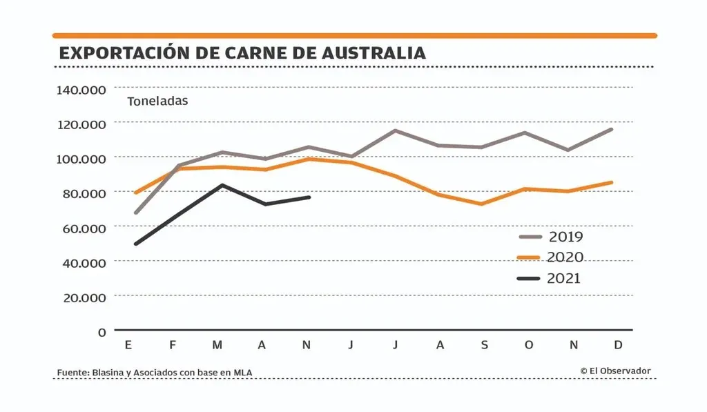 La producción australiana cae por debajo de los dos millones de toneladas, a 1,95 millones, 175 mil menos que en 2020 y 500 mil menos que en 2019, cuando la sequía presionaba a la faena.