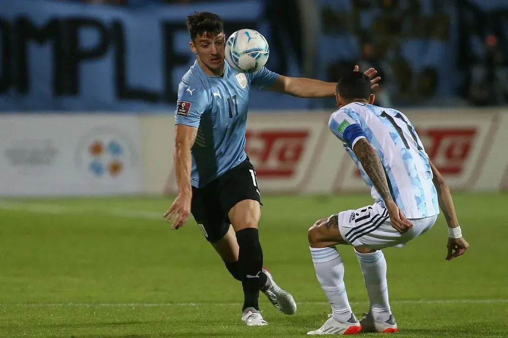 Marcos Acuña le gana la posición a Nahitan Nández de Uruguay