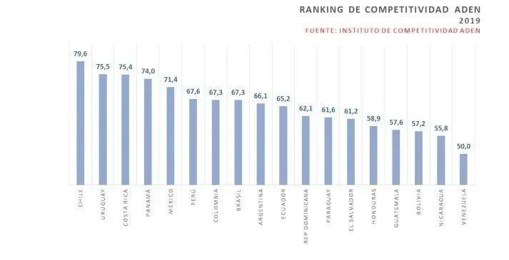 En el quinto lugar se ubica México, con cierta distancia del puntaje de sus antecesores y, a su vez, separado de los países que le siguen. El estudio de ADEN destaca que muestra un nivel de competitividad "aceptable", por una mejora en su puntuación en los últimos dos años.