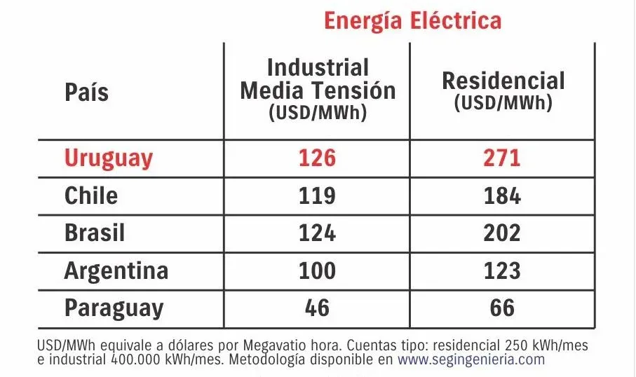 El informe muestra que el precio del megavatio hora (MWh) para una industria de media tensión en Uruguay alcanzó los US$ 126 durante el tercer mes del año. Esa misma cantidad de energía se obtenía en Chile a US$ 119, en Brasil a US$ 124, en Argentina a US$ 100 y en Paraguay a US$ 46.