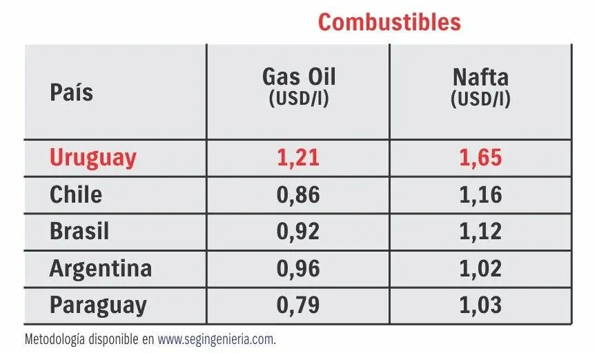 Para el caso del gasoil, el ranking es muy similar. En Uruguay el litro costó US$ 1,21 y le siguieron en precios Argentina (US$ 0,96), Brasil (US$ 0,92) y Chile (US$ 0,86).