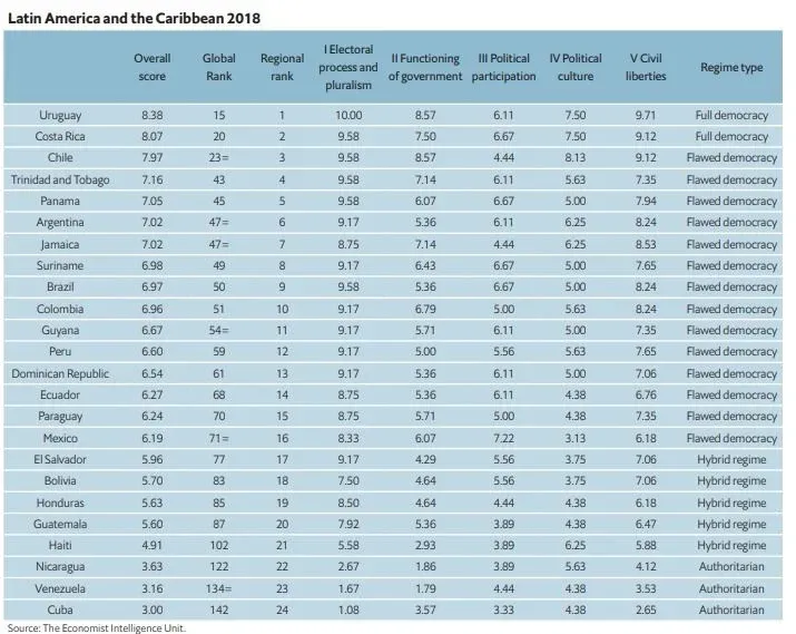 El ranking, que se publica todos los años, afirma que América Latina sigue siendo una de las regiones del mundo con mejor salud democrática; no obstante, ha sufrido deterioros que la hacen caer de 6,26 puntos en 2017 a 6,24 en 2018. De esta manera solo Latinoamérica y Europa sufrieron descensos en la calidad de la democracia, mientras que el resto del mundo se mantuvo o aumentó.