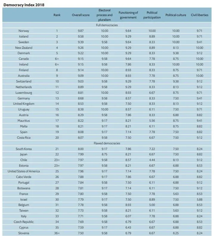 A nivel internacional los países desarrollados de Europa son los que tienen una democracia plena, encabezando la lista Noruega.