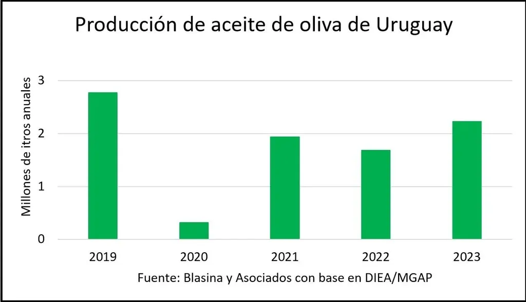 En el período 2019-23 creció año tras año el consumo local de aceite de oliva extra virgen producido en Uruguay. Quebró la hegemonía de los aceites importados y alcanza una cuota de mercado de alrededor del 60%, según estimaciones de la Asociación Olivícola Uruguaya (Asolur).